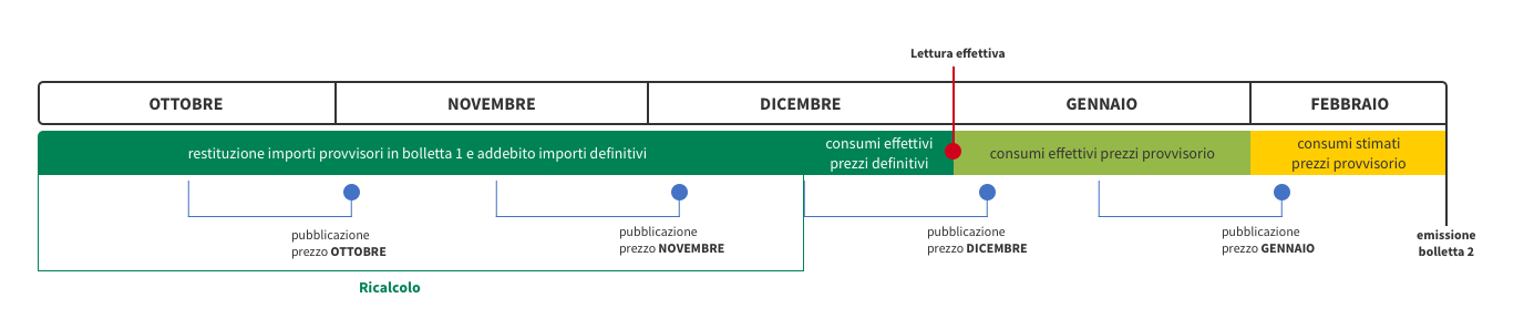 • periodo 01/10 – 30/11: restituzione degli importi relativi ai consumi stimati fatturati in bolletta 1 e conseguente addebito dei consumi effettivi.